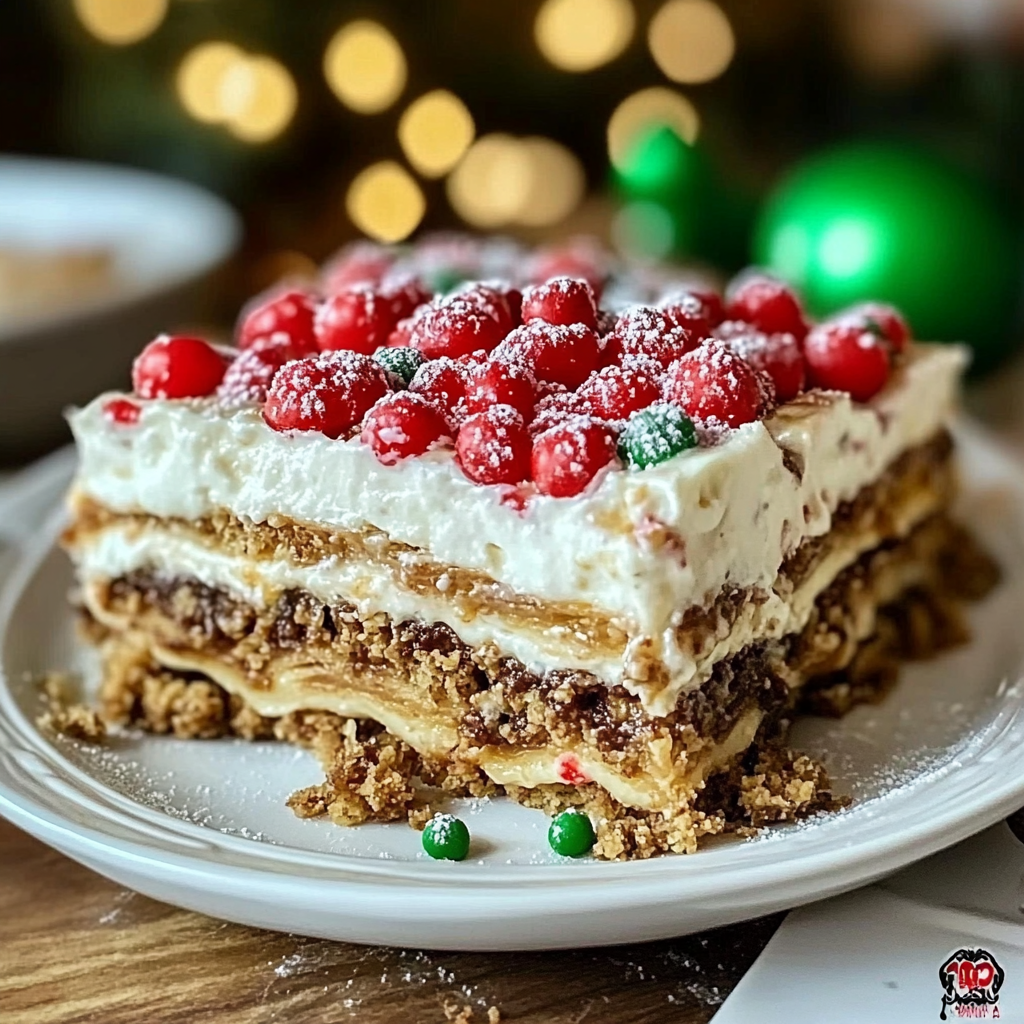 Christmas Cookie Lasagna is a layered dessert combining cookie layers, cream filling, and festive toppings.